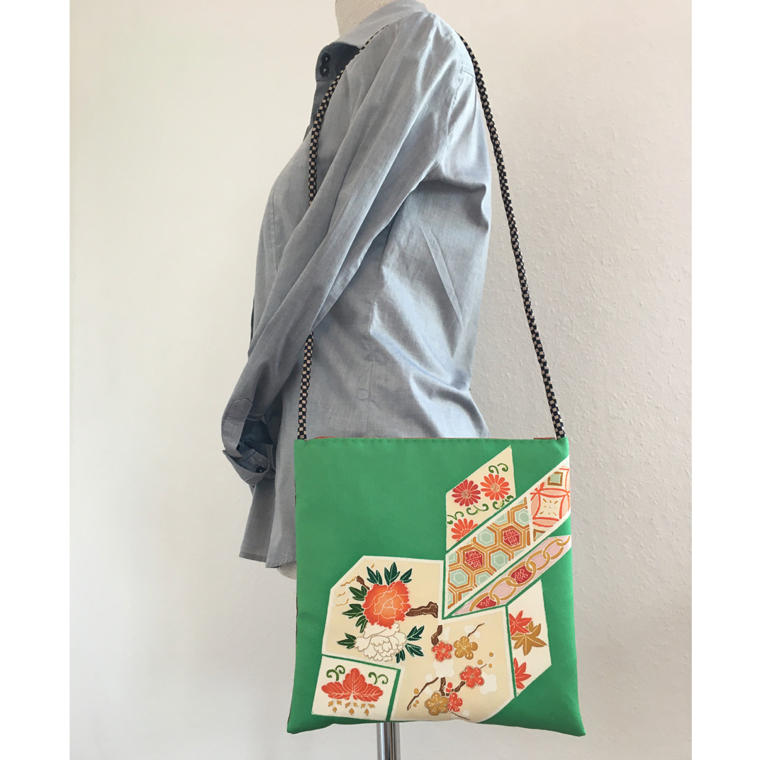Der dritte Versuch: eine schmale Schultertasche. Ich habe das Stück mit einem Kragenteil (1/2 Kimonobreite) kombiniert.