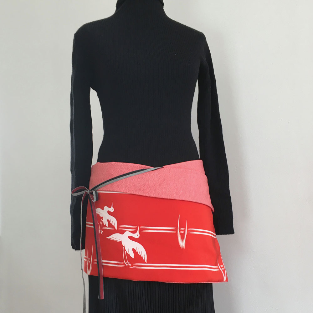 Das Stück wird um die Hüfte eingewickelt. Es passt zu einem schlichten Kleid oder über der Hose. Wer Lust hat, kann man auch wie eine Schärpe über die Schulter tragen. Hier weden zwei Seidenstoffe kombiniert: eine Seite mit dem auffallenden Muster und eine Seite mit dem eher schlichtem Muster. Die Breite entspricht die Breite des Kimonostoffes. Entdeckt habe ich diesen Rock in einem Heft “The skirts of Japanese clothe”, Yoko Imamura 2003.