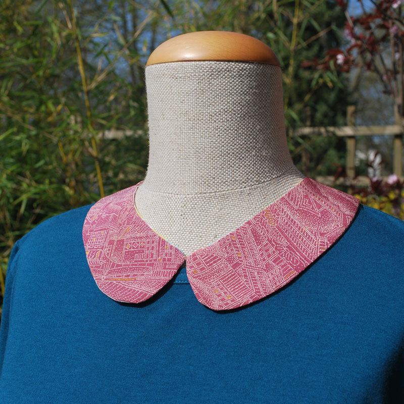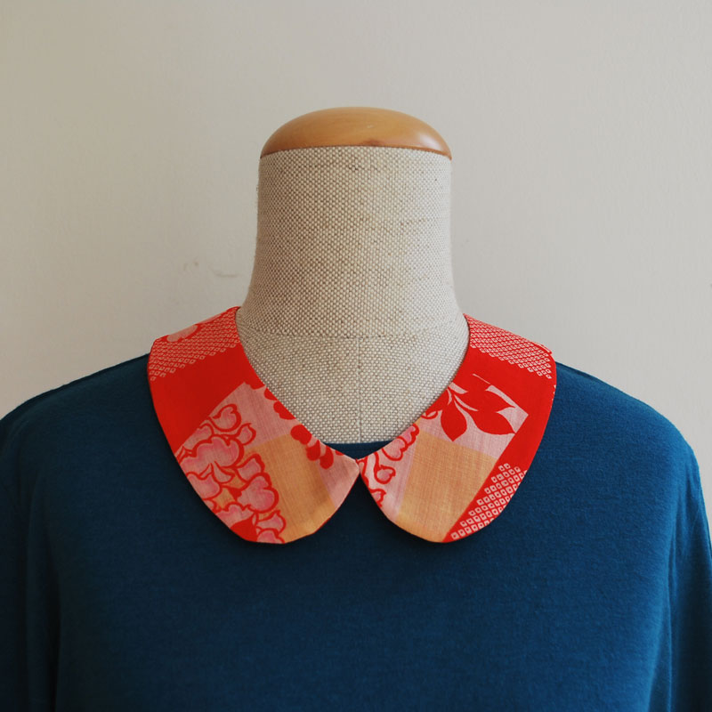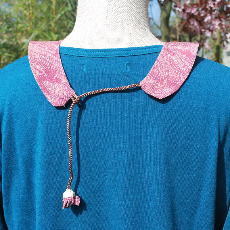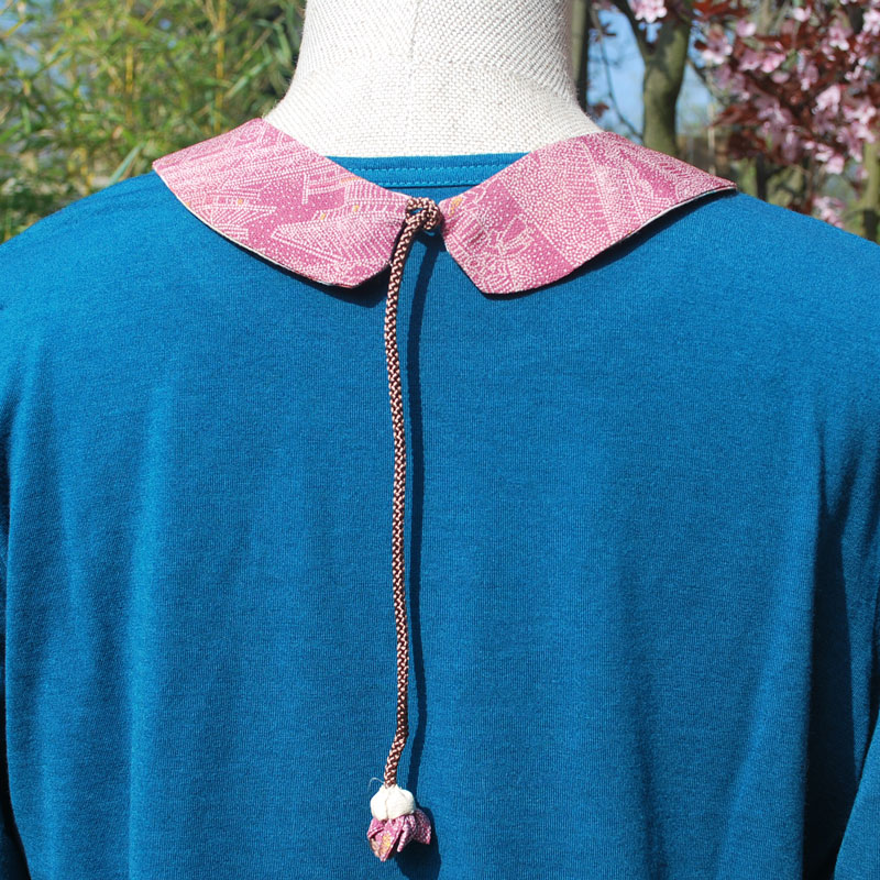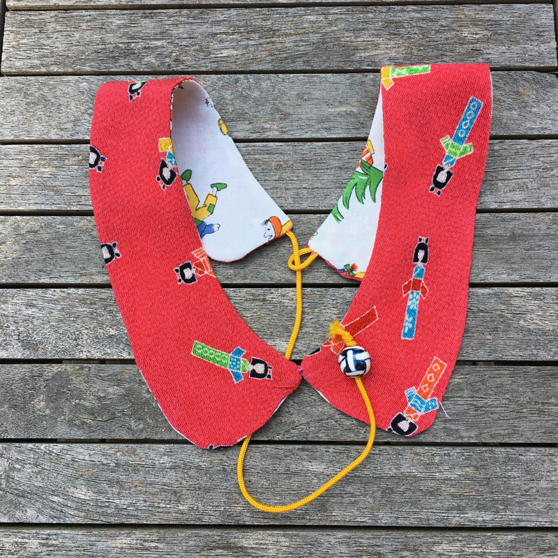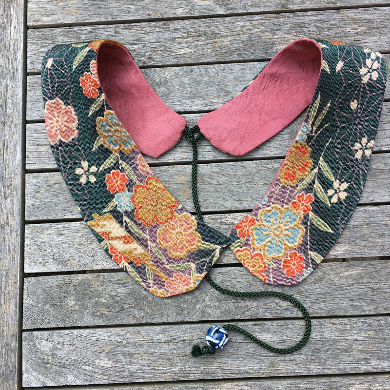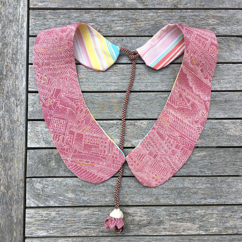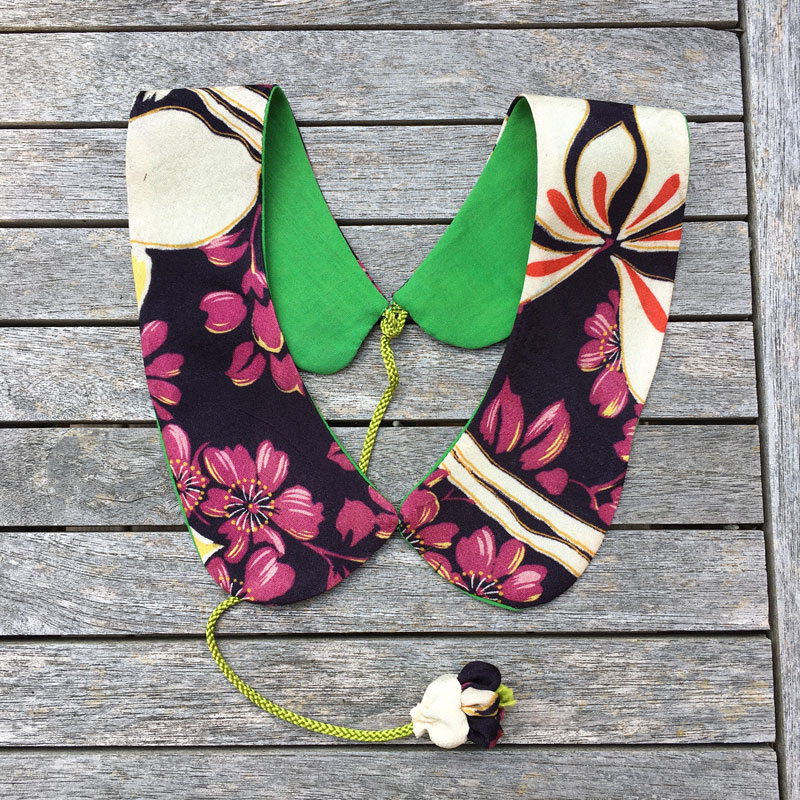 Schöne Stoffe können wir nicht weggewerfen, egal wie klein der Stoffrest ist. Eine Freundin aus Kyoto hat diese wunderschöne Kragen genäht. Dank Kordel mit Perle passt er jedem ohne einen Knopf.