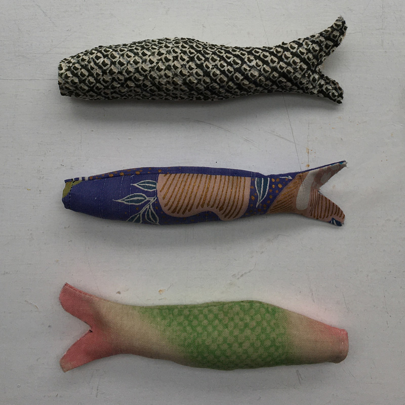 Dass in Japan die Karpfen fliegen, ist hierzulande auch bekannt. Meine Fische sind ehr kleine Fische, ähnlich wie die bunte Sardine aus Stoff, die ich mehrfach in den Gassen von Lissabon gesehen habe. Das Maul habe ich doch nach Koi empfunden. Sie sollen ja in der Luft hängen.