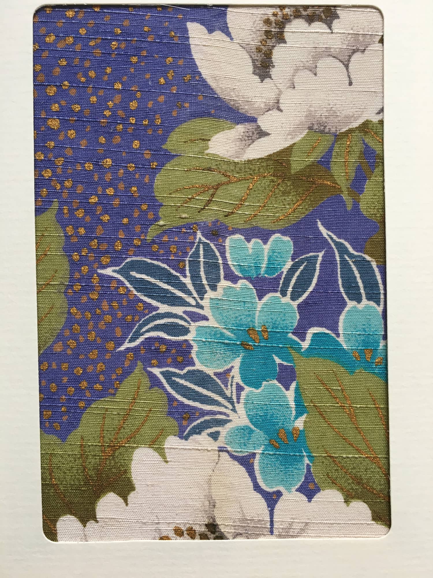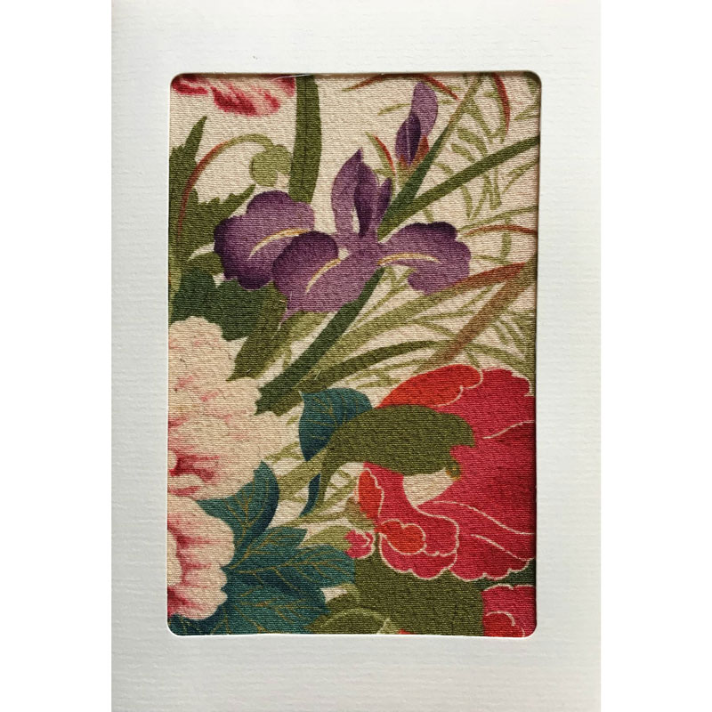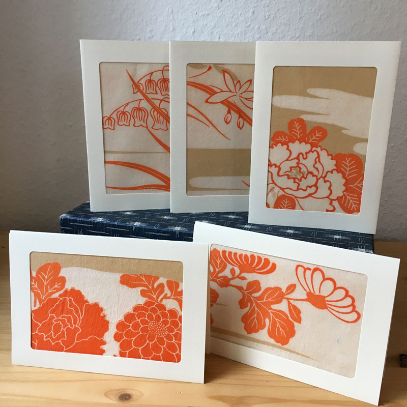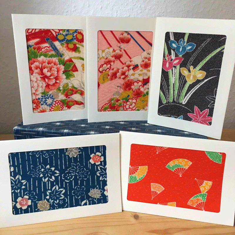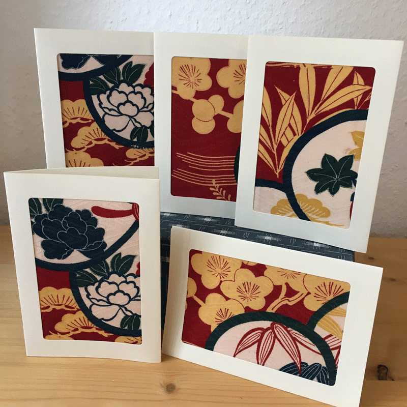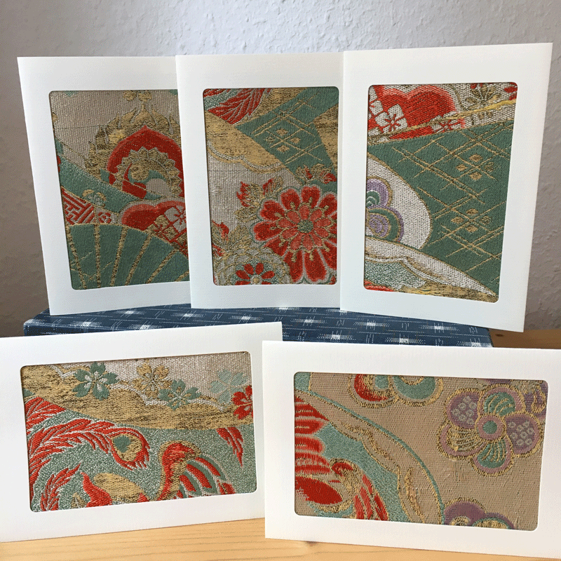 Grußkarten aus alten Kimono Stoffen. Das schönste Detail der Kmonostoffe wird eingerahmt.