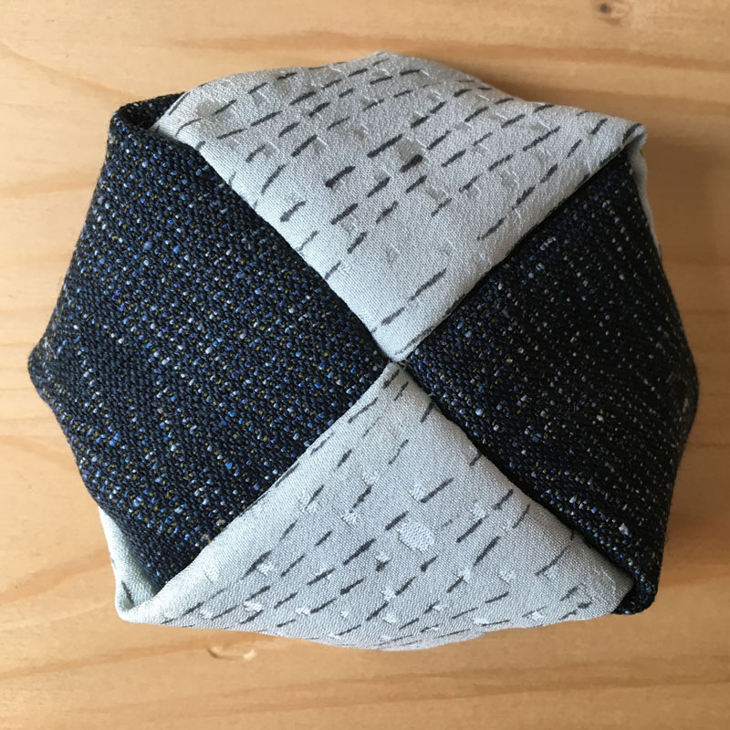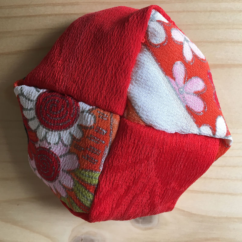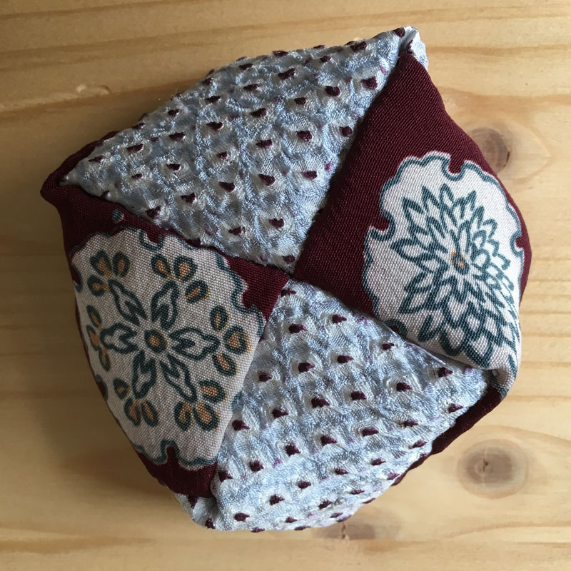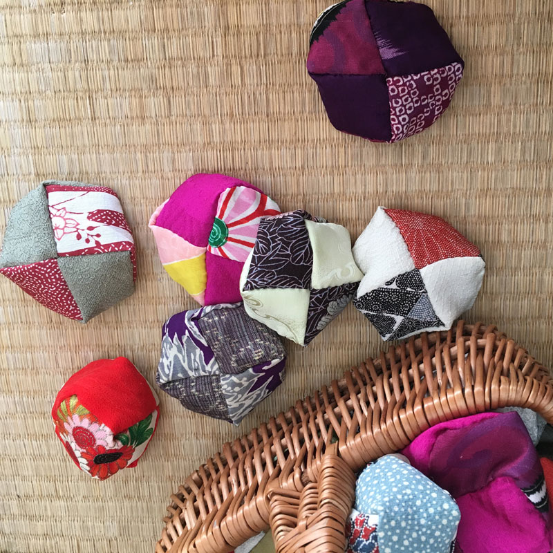 Otedama nennt man diese Jonglierbälle in Japan. 4 Stoffstreifen werden zusammen genäht und mit Bohnen oder Reis, was man so zuhause hat, gefüllt. Für die Jonglieranfänger*innen sind Otedama sehr praktisch; Wenn die Bälle aus der Hand fallen, müssen Sie nicht hinterher laufen. Otedama rollt nicht weg.