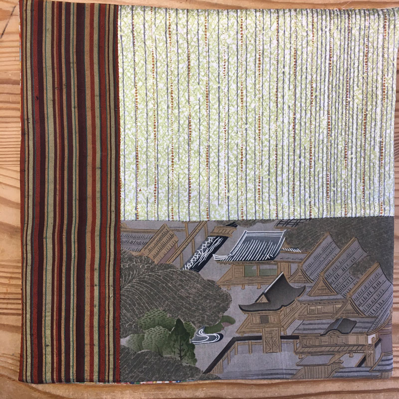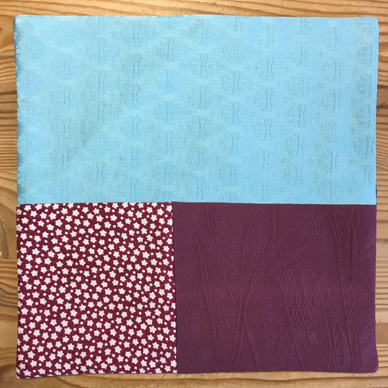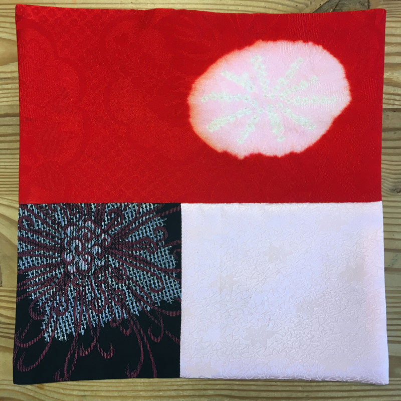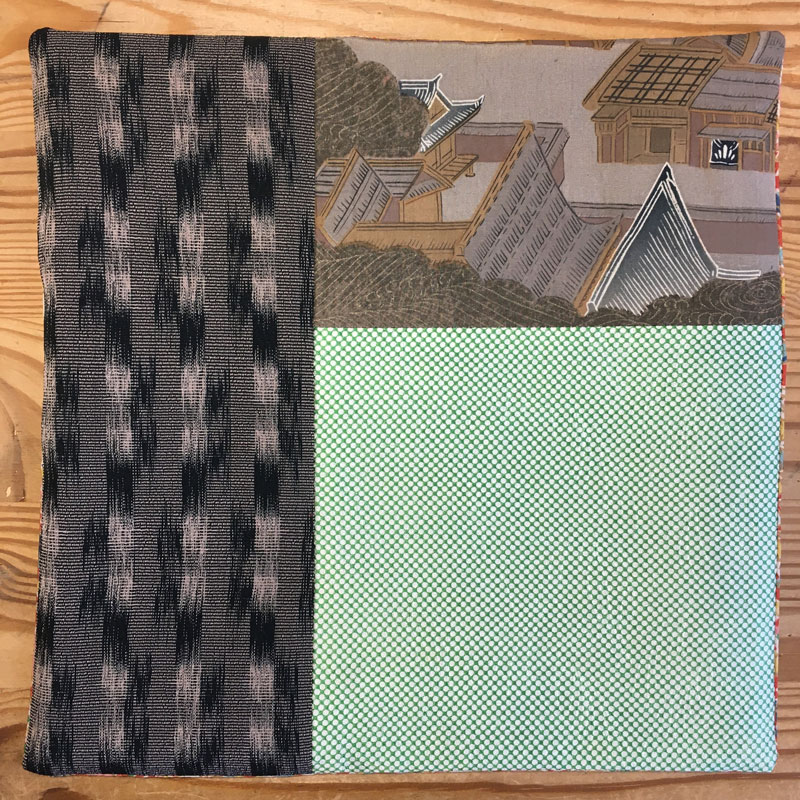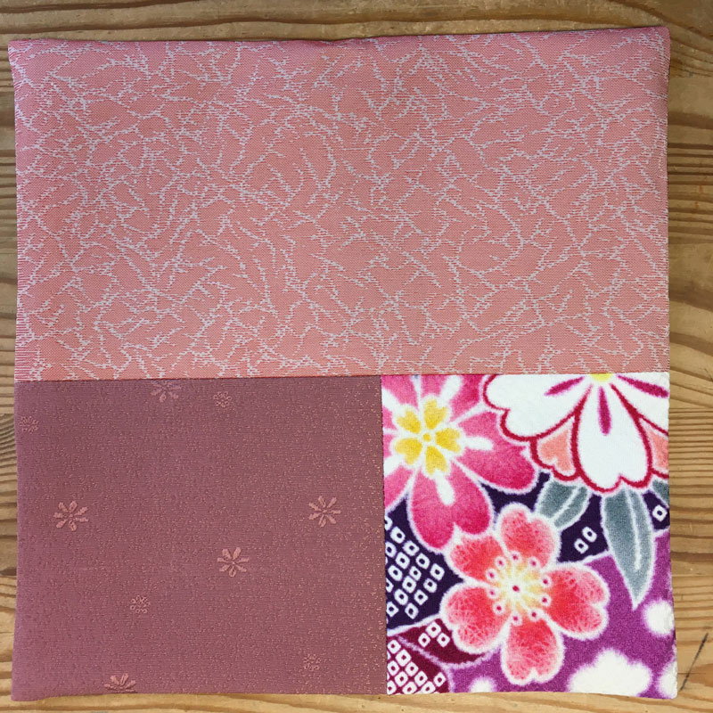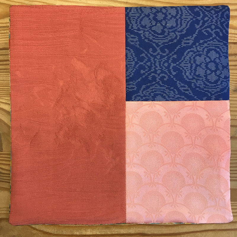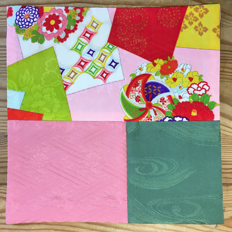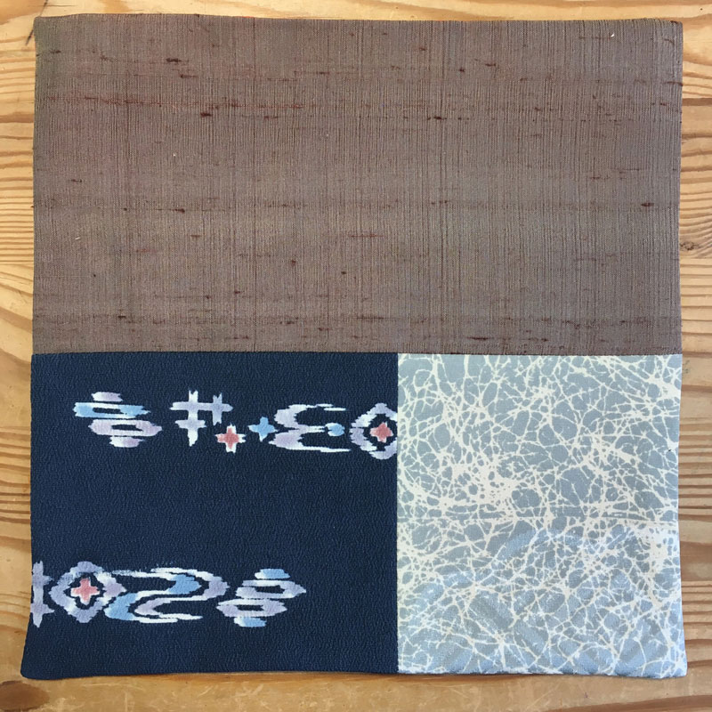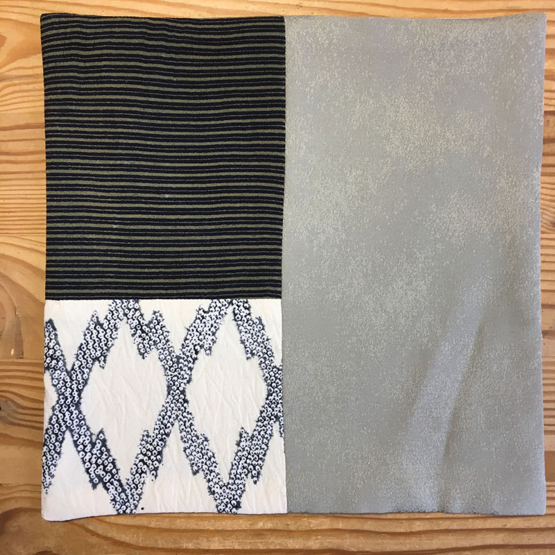 Aus Freude der Verwendung von schönen Seidenstoffen im täglichen Leben entstand diese quadratische Stoffcollage. Bilder ohne Rahmen. Ein Blickfang im Zimmer. Ein fester Platz fürs Mobiltelefon zu Hause, auch für die Lesebrille und den Schlüsselbund. Ein Podest für die schöne Dinge. Ein Platzhalter!