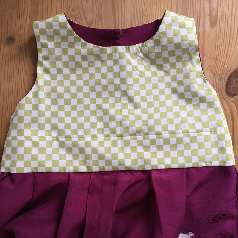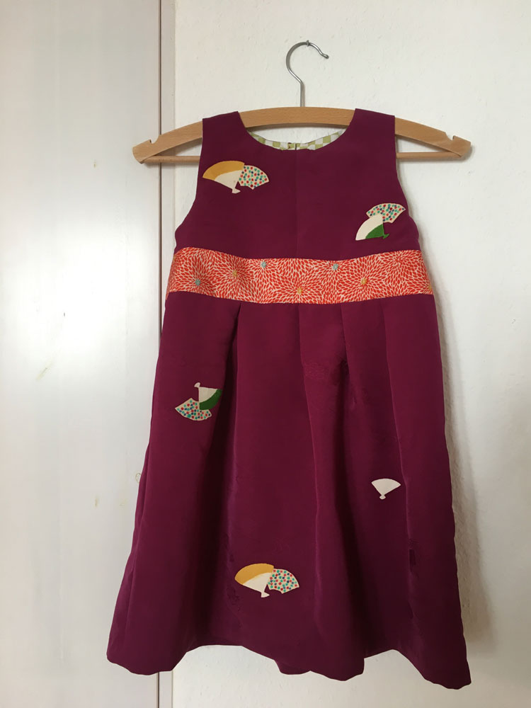 Für das Kleid (Gr. 128)wurde 3 m benötigt. Zusätzlich für das Bündchen wurde der bunte Futterstoff einer Michiyuki-Jacke angenäht. Besatz ist aus Bio Baumwolle.