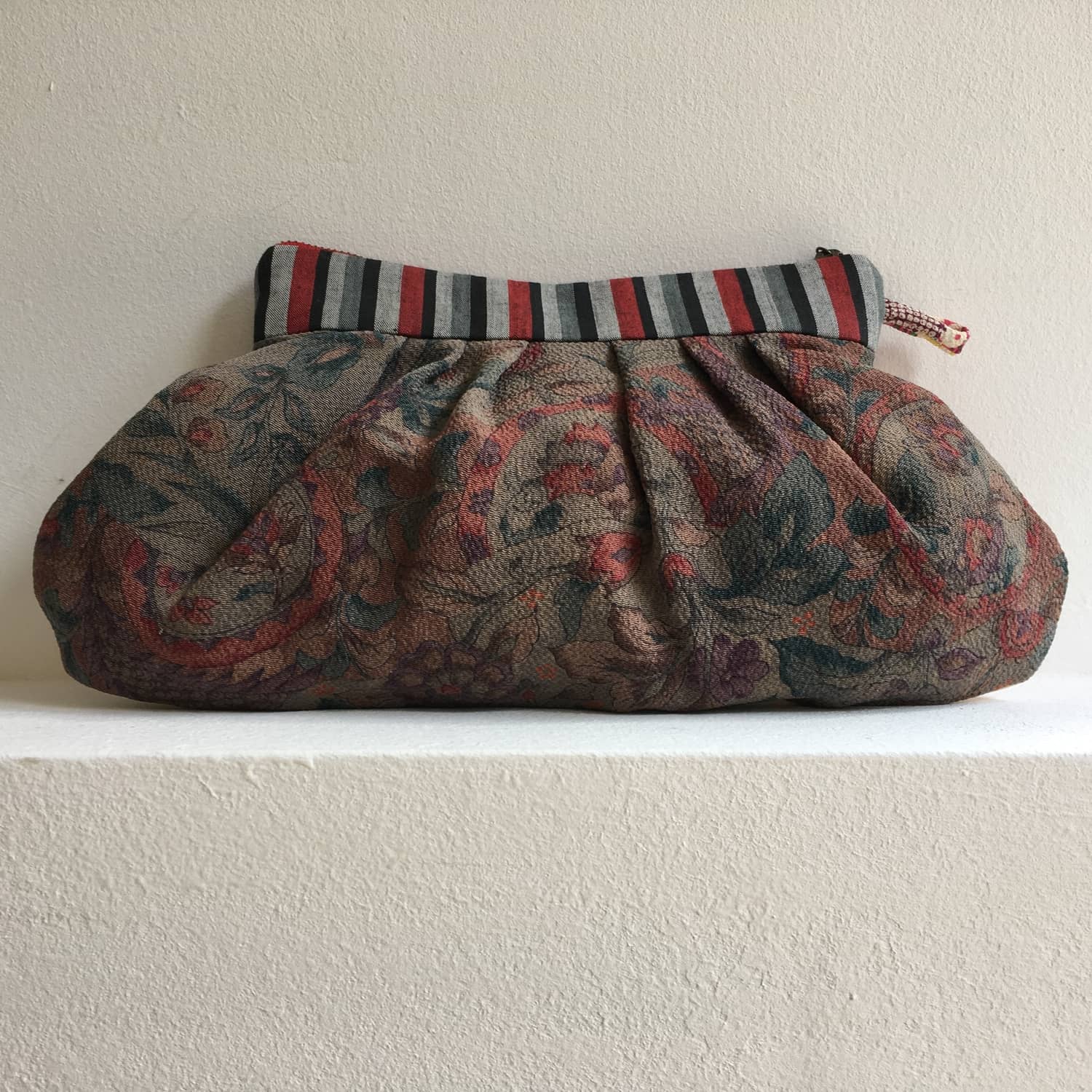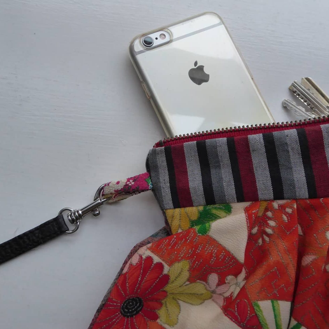 Kleine Tasche für unterwegs. Die Stoffbreite entspricht der Breite des Kimonos. Durch mehrfaches Falten erhält die Tasche Volumen und bitetet Platz für wichtige Dinge wie Telefon, Schlüsselbund, Portemonnaie und Taschentuch. Praktisch ist die Schlaufe seitlich an der Seite der Öffnung: Mit einem Schlüsselband am Rucksack befestigt, findet man das wichtigste beisammen.