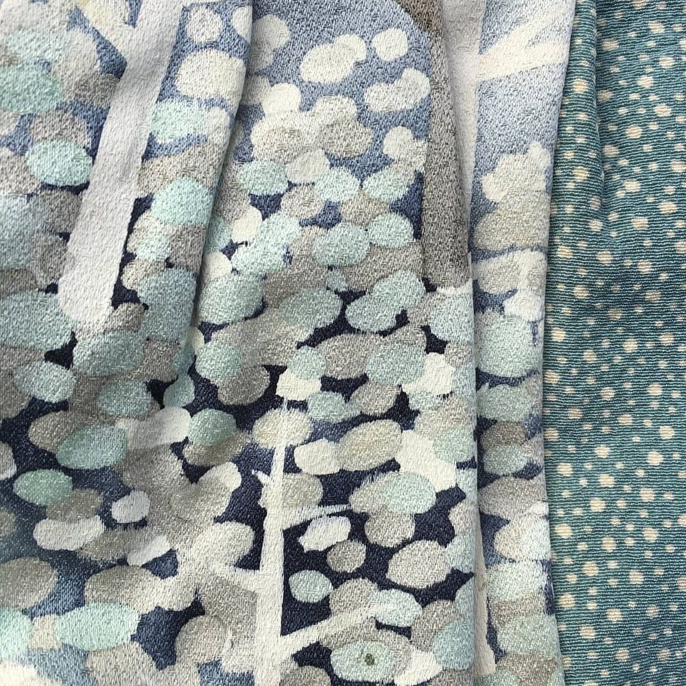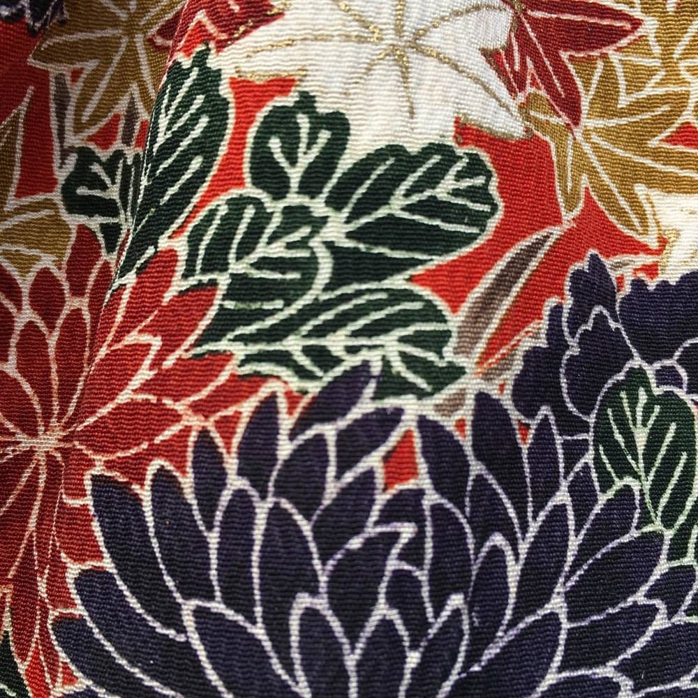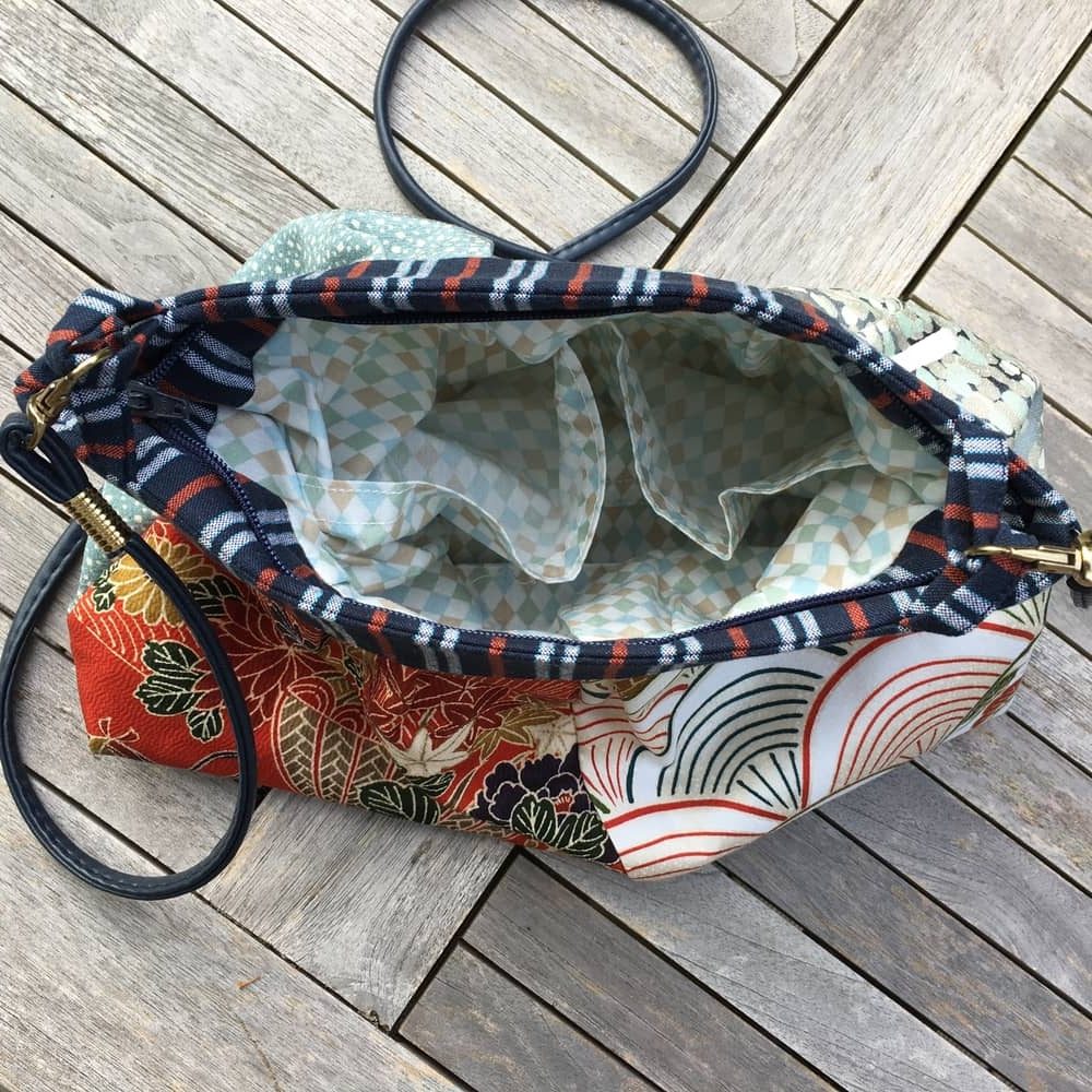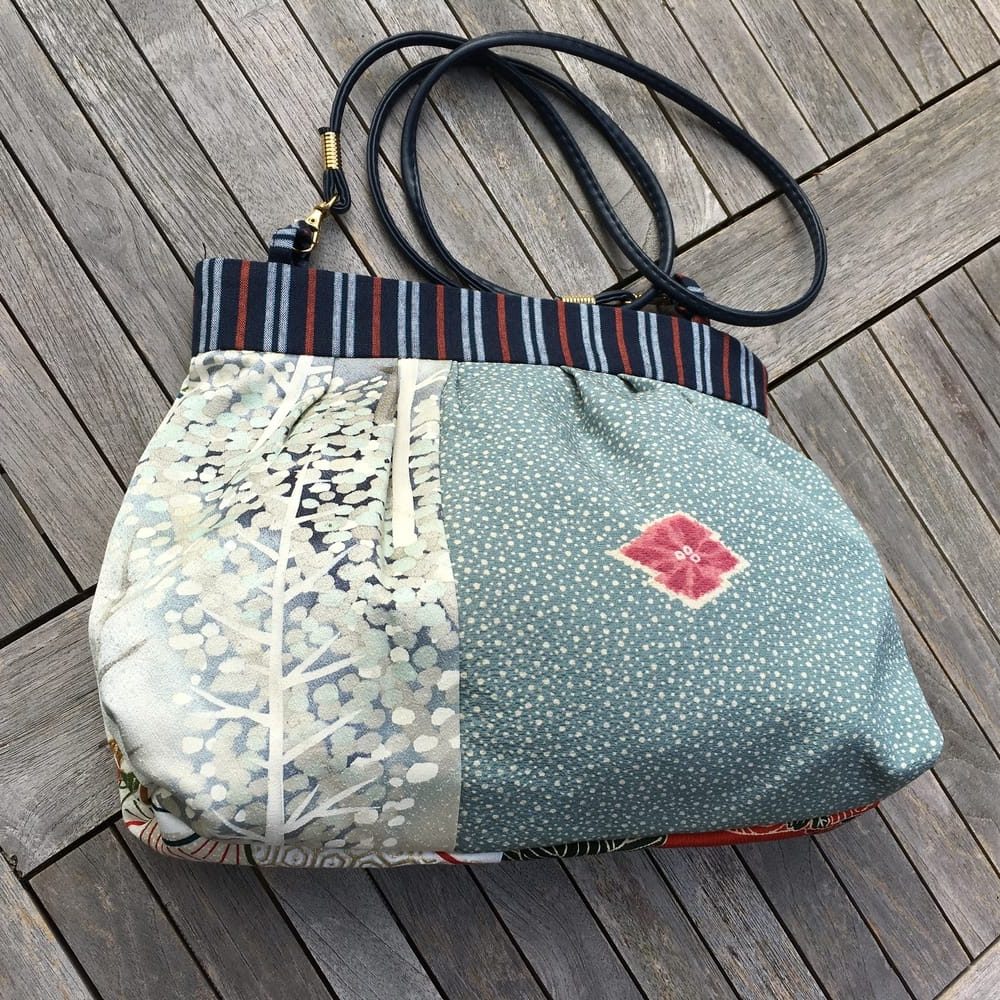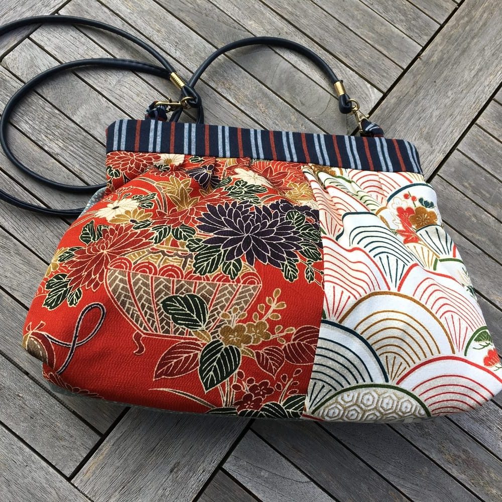 Diese Tasche wurde mit vier verschiedenen Kimonostoffen verarbeitet. Zwei verschiedene Farbkombinationen: je nach Garderobe kann man die passende Seite wählen und Tragriemen mit Karabinerveschluss anlegen.