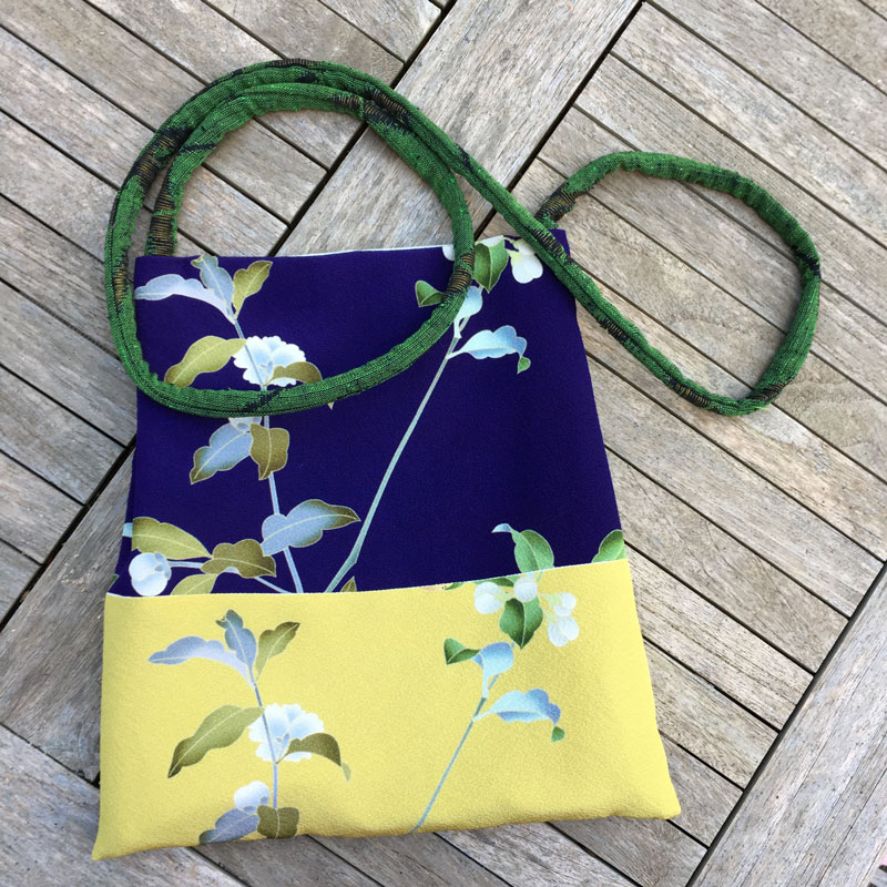Die wunderschönen Stoffe, ein Musterpanel in zwei verschiedene Farben, habe ich bei Korokan in Berlin gekauft. Dazu habe ich noch einen Kimonostoff in zartem Grün kombiniert. Die ganze Tasche ist sehr leicht. Ideal für den Museums- oder Theaterbesuch, wenn man die große Tasche an der Garderobe abgeben und nur das Nötigste mitnehmen möchte.