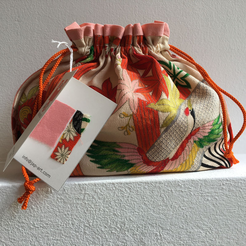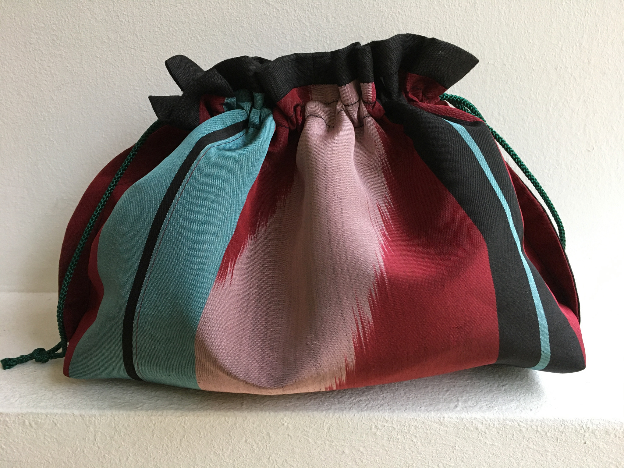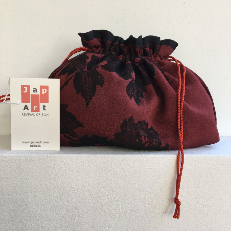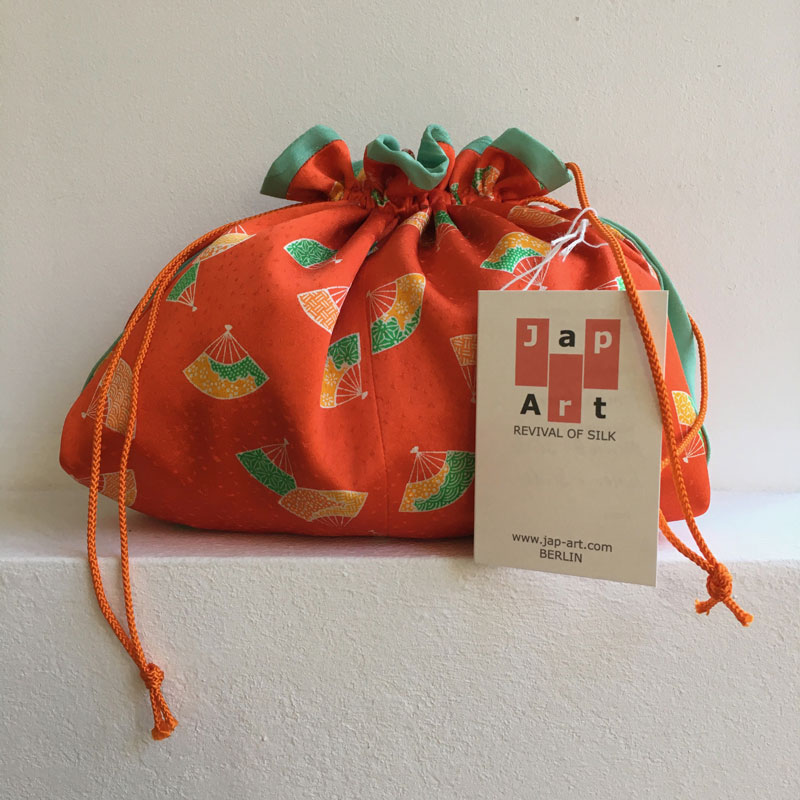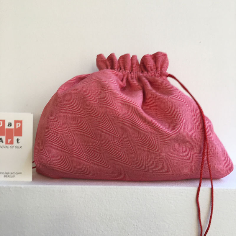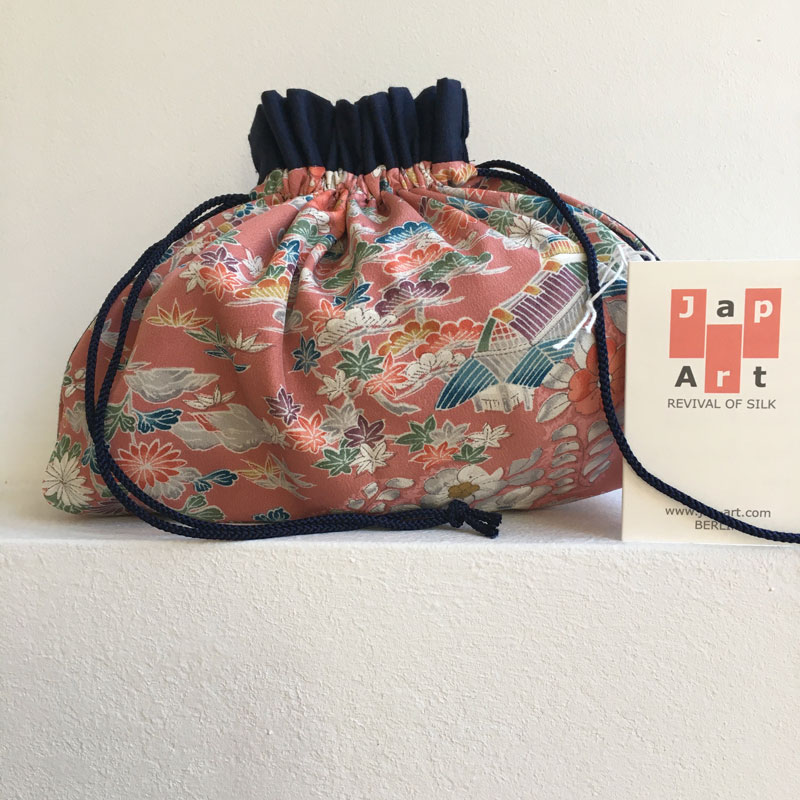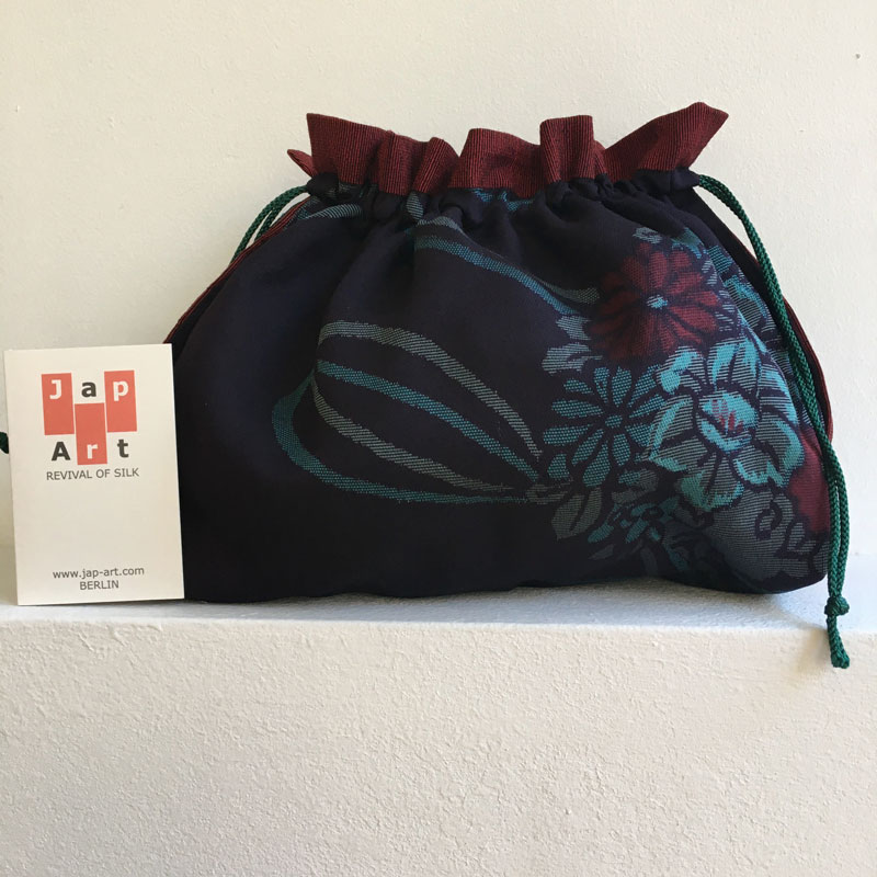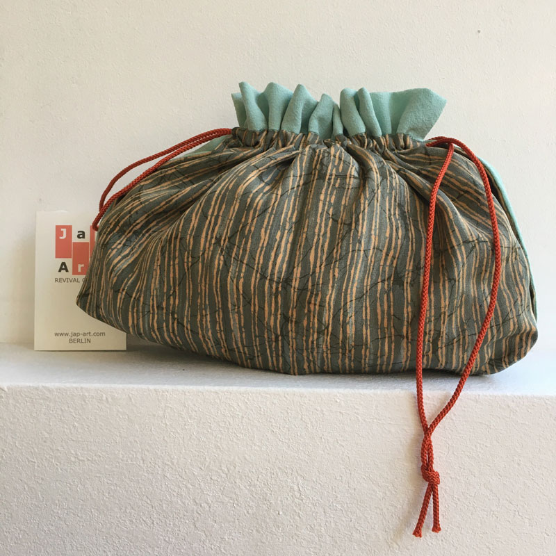 In Japan bezeichnet man den kleinen Stoffbeutel Kinchaku-Bukuro. Es gibt sehr viele Variante. Bei dieser Tasche spielt die Farbe des Futterstoffes besondere Rolle.