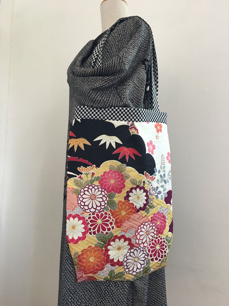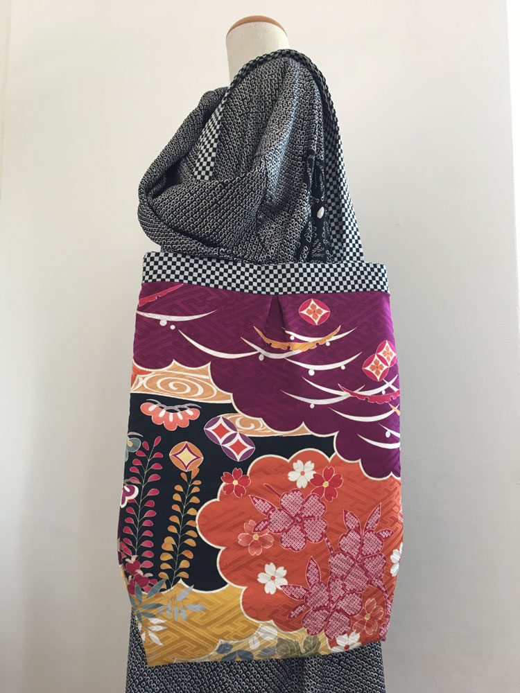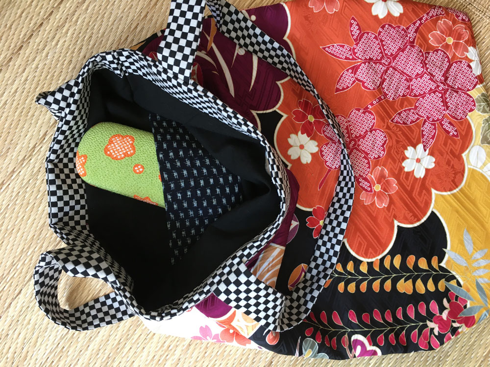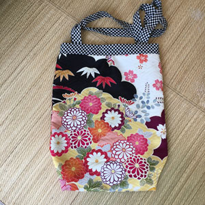 Wie soll der Stoff für einen Furisode / Festtagskimono aussehen? Kimonostoffhändler macht Stoffprobe. Aus so einer Stoffprobe habe ich diese Tasche genäht. Die Länge der Paneele bestimmt die Taschengröße.
