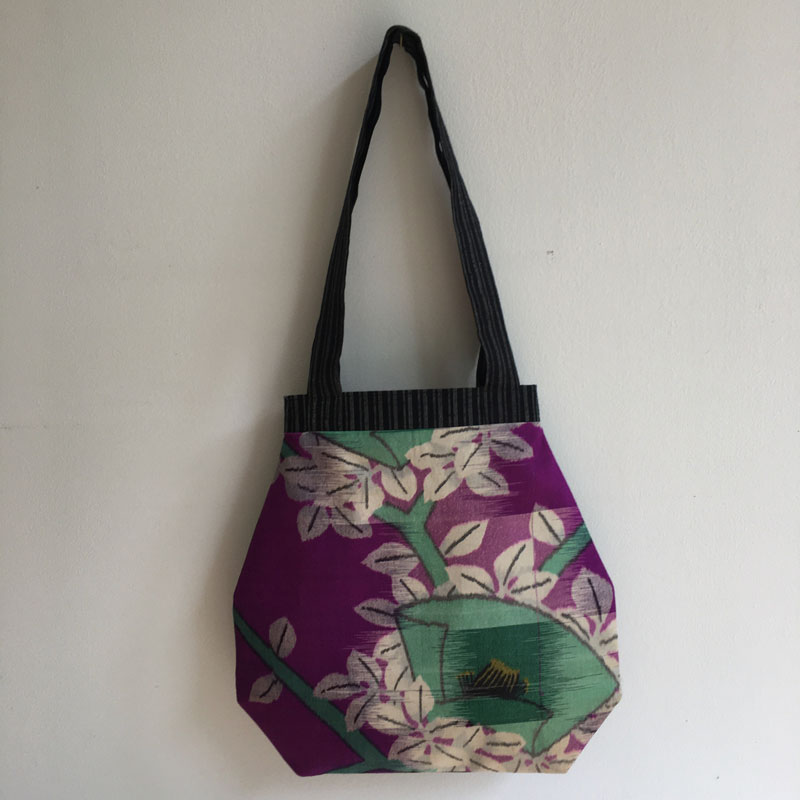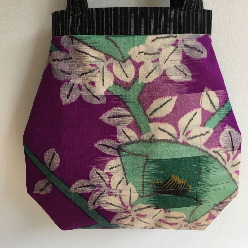 Die Zeit zwischen Meiji und Shōwa nennt man Taishō. Die Kultur,die in dieser kurzen Zeit (1912-1926) aufblühte, bezeichnet man Taishō Roman (romantische Taishō). Kimono Muster in dieser Zeit sind sehr modern und ich sehr darin die Suche der Menschen nach Neuem. Auf dem strahlenden Violett eingewebte Kamelie in Grün erinnert mich an Bilder von Franz Marc. Wer diese Tasche trägt, trägt Kunst!