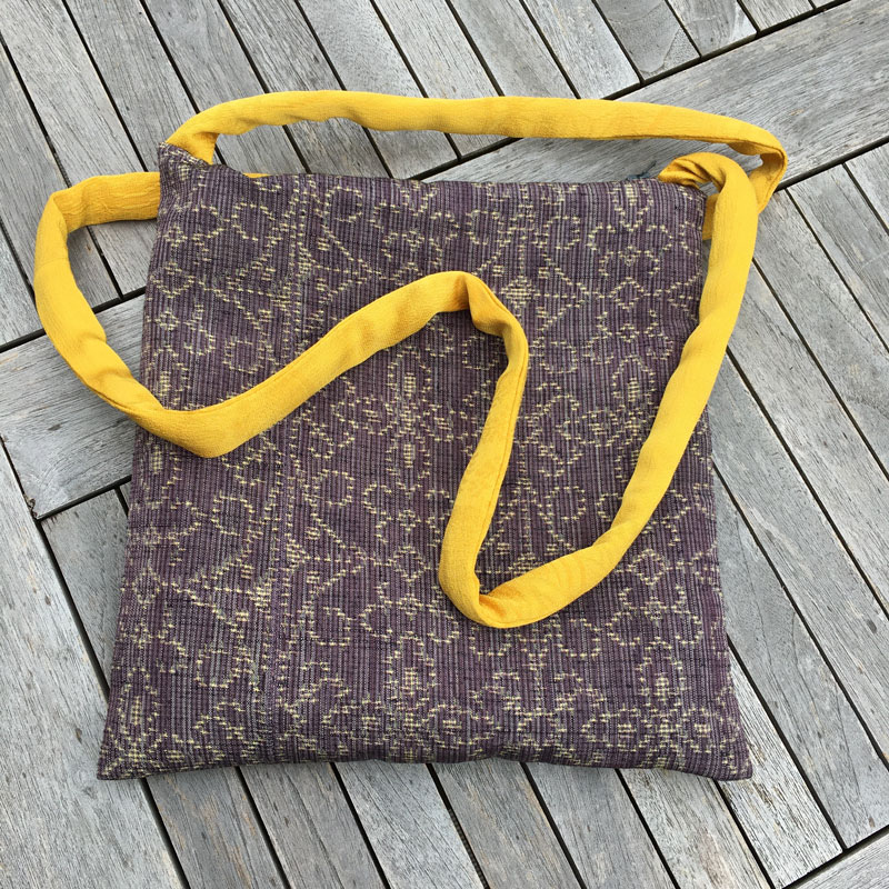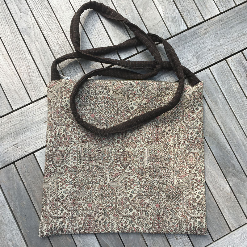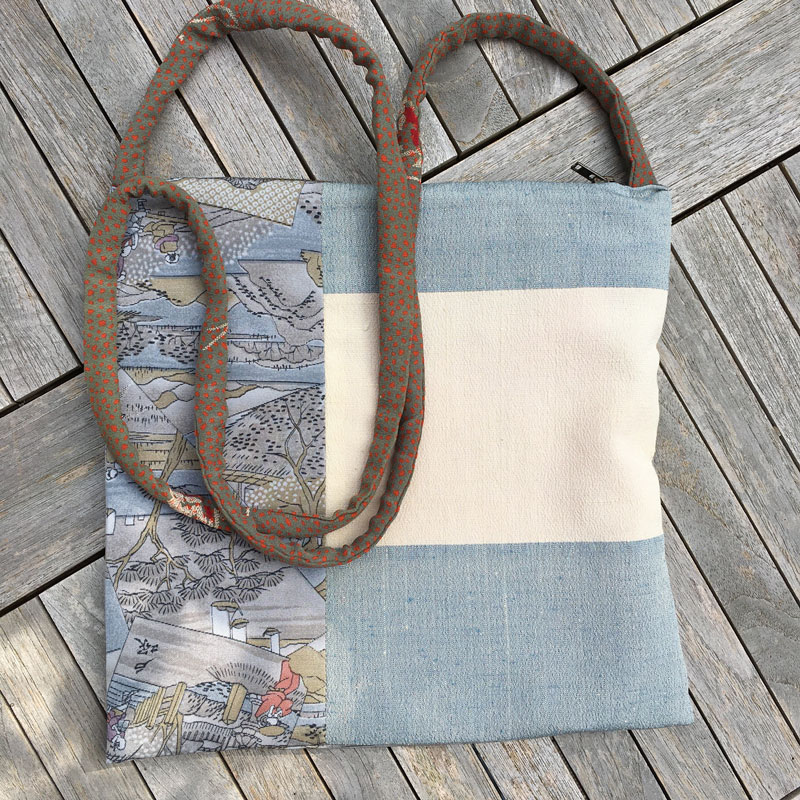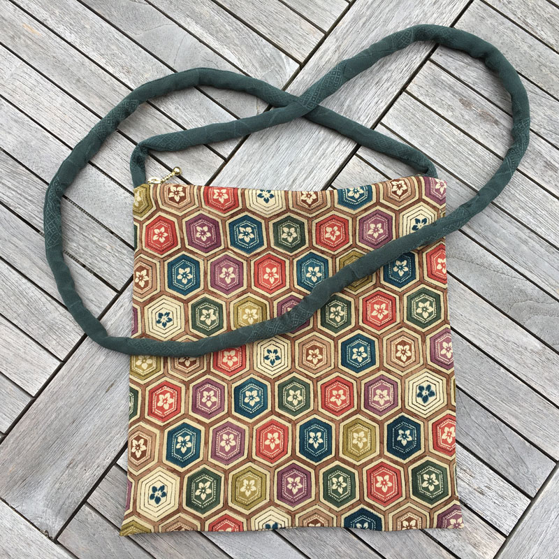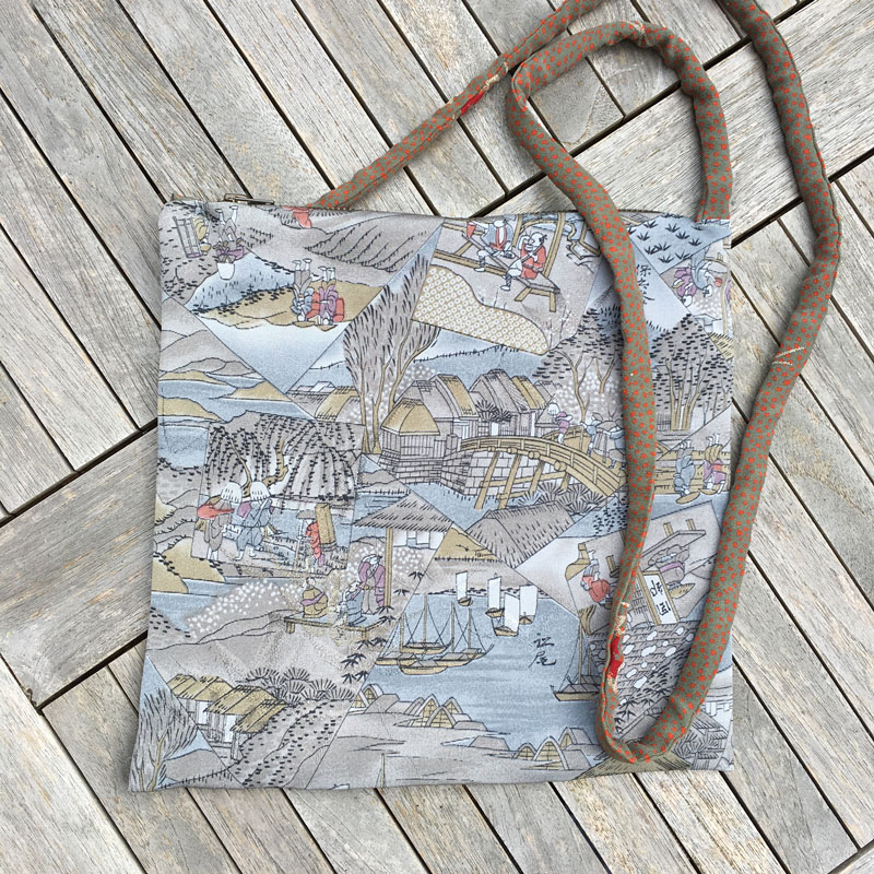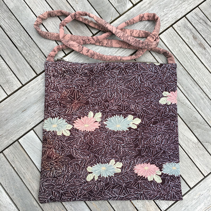 Für diese Modell habe ich zwei verschiedene Kimonostoffe kombiniert: 1x Stoff in voller Breite und 1x Stoff in Kragenbreite. Sie wiegt nur 50g. Ideal für den Museums- oder Theaterbesuch, wenn man die große Tasche an der Garderobe abgeben und nur das Nötigste mitnehmen möchte.